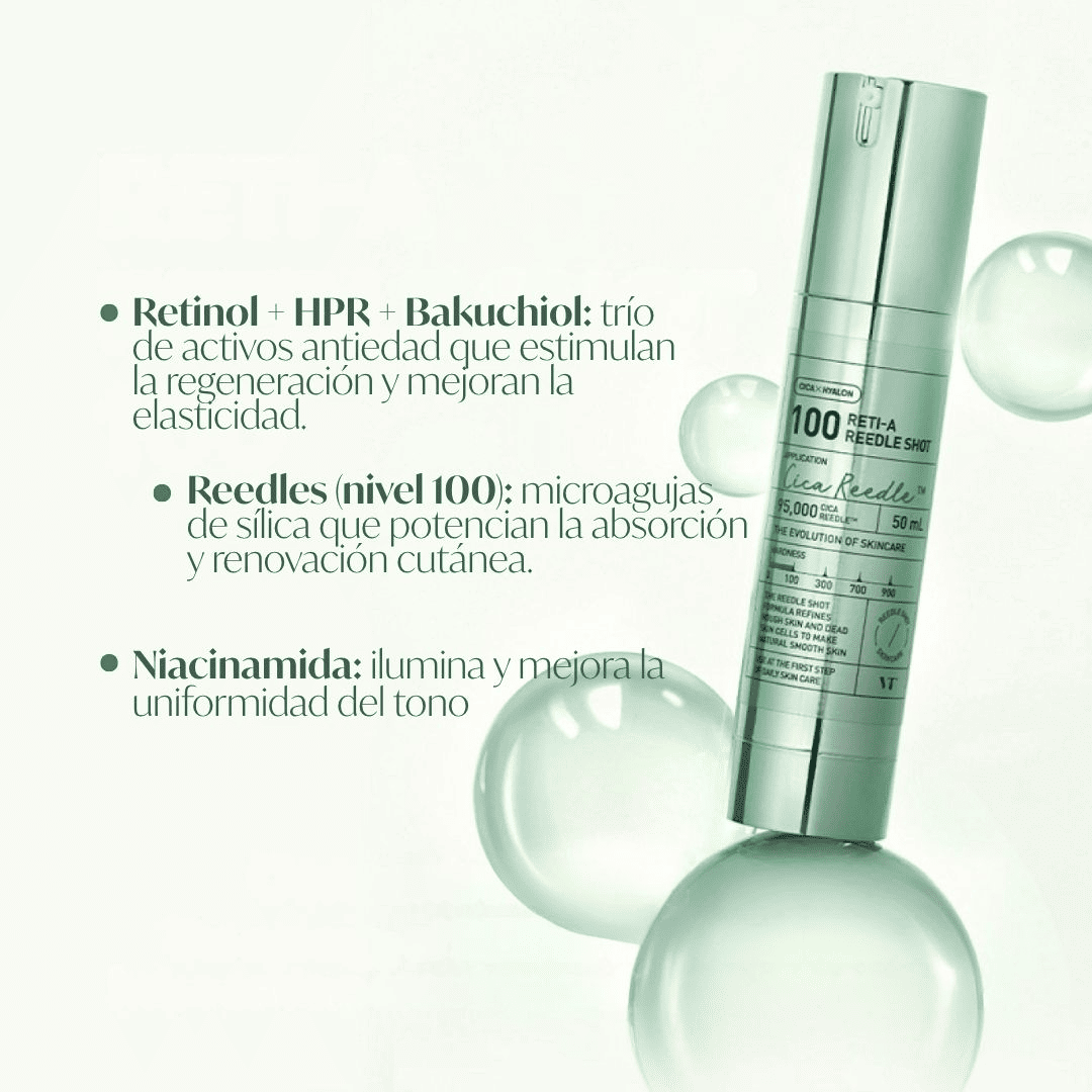 Rejuvenece tu piel con VT Reti-A Reedle Shot: retinol + HPR + bakuchiol y microagujas nivel 100 para firmeza, luminosidad y textura renovada.
